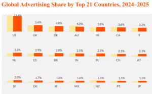 The United Kingdom (5.6%), Germany (4.8%), and Australia (4.2%) follow closely behind. Together, developed markets in Europe and North America contribute over 30% of global ad spend, reinforcing their role as the core regions for cross-border brand expansion.